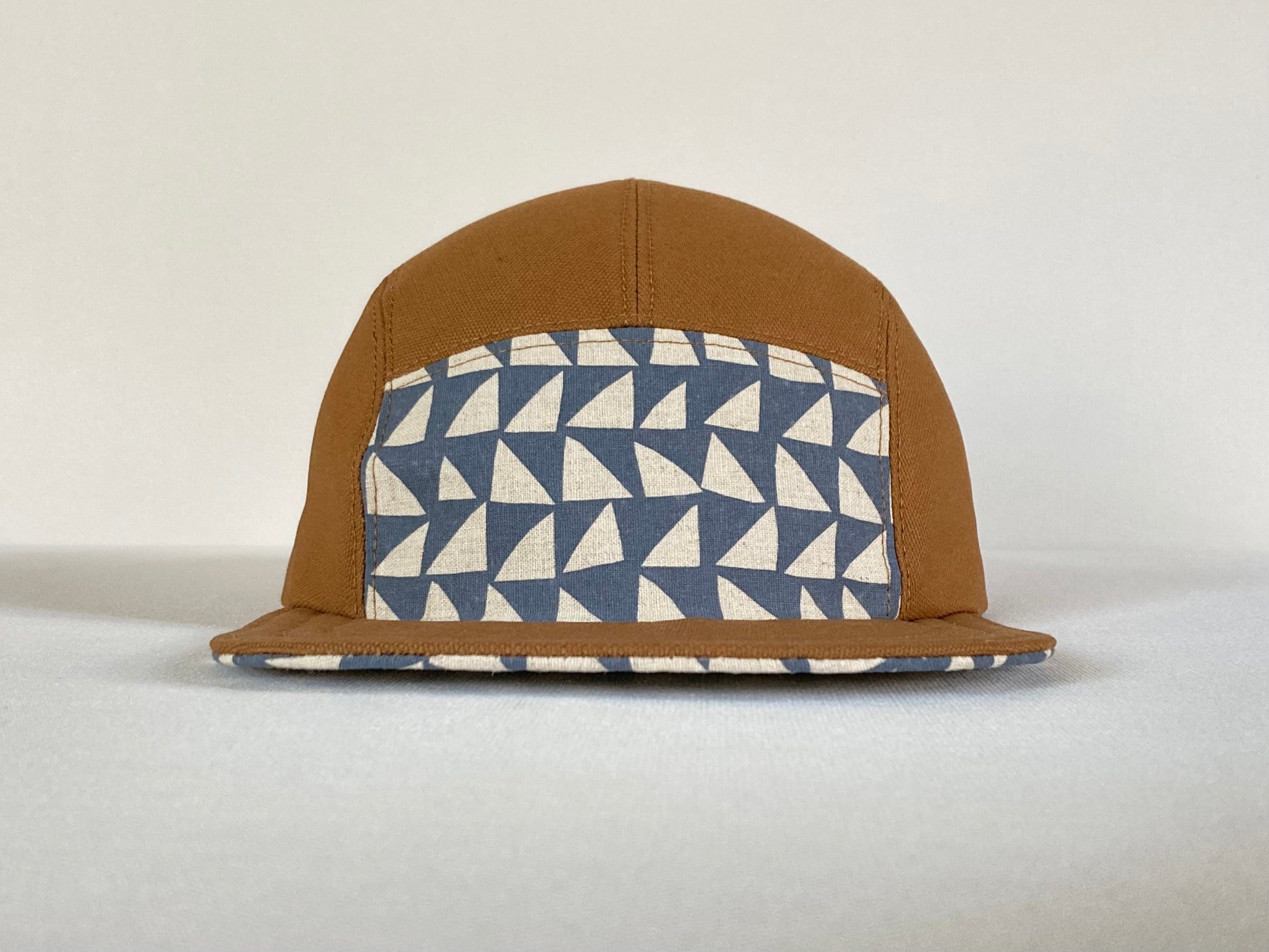 Made from scratch, soft brimmed five panel cap featuring a hand printed pattern on the front panel and under brim. Each hat is handmade from start to finish with meticulous care, and is made to be lived in.