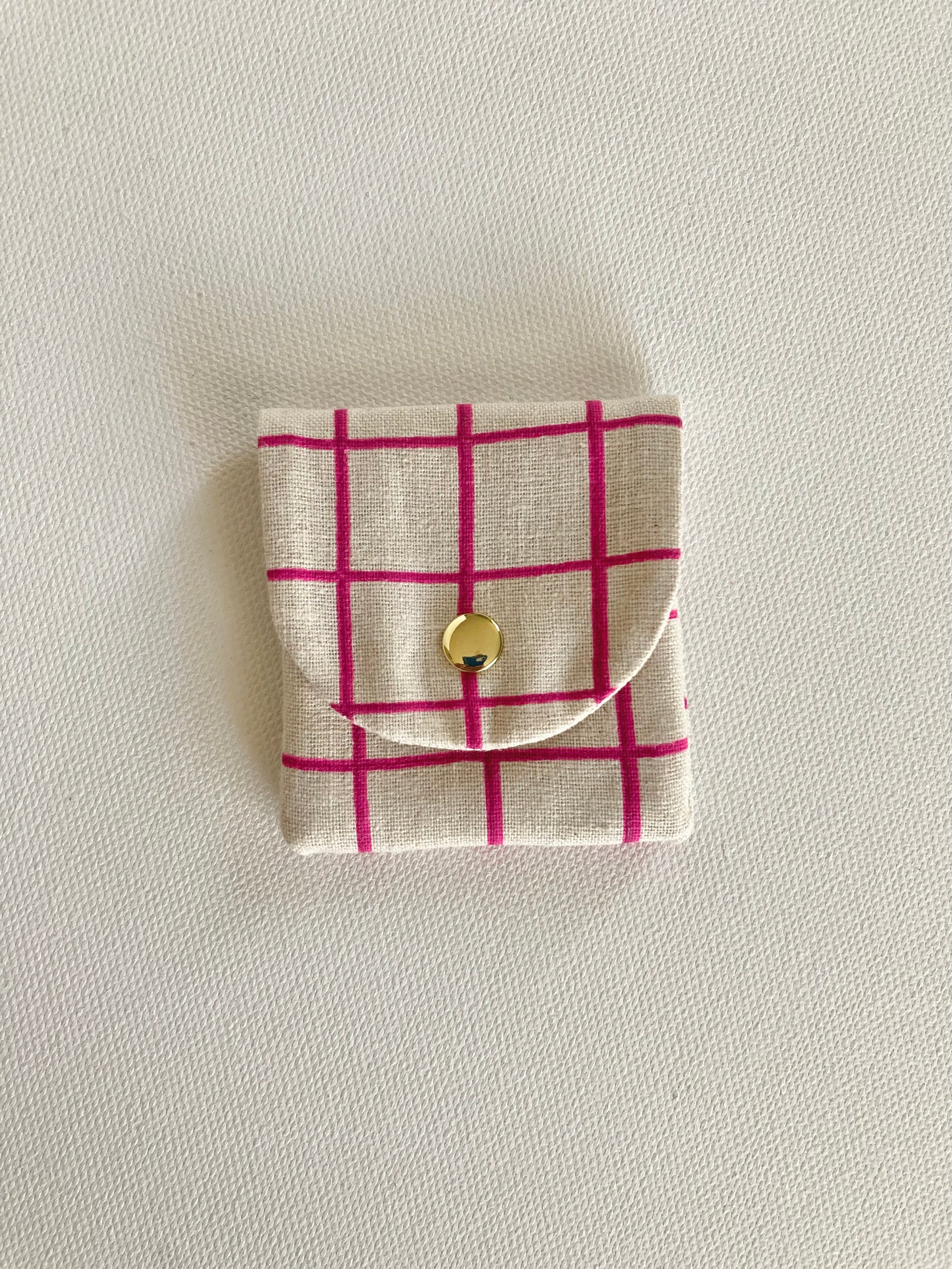 Made with a hand printed linen/cotton blend and lined with organic cotton canvas. Measures 2.5 x 2.5 inches. Necklace drop measures approximately 14 inches.
