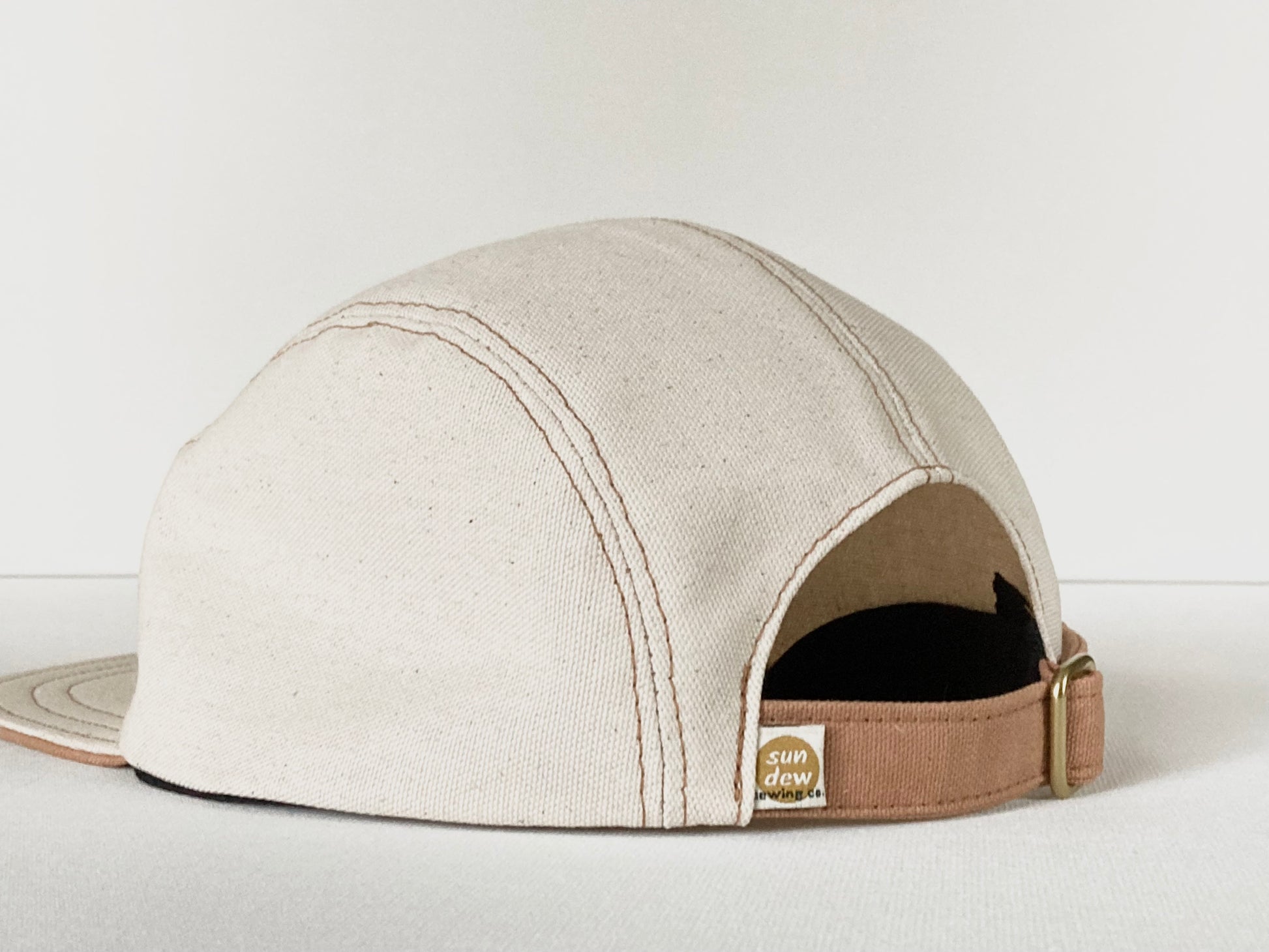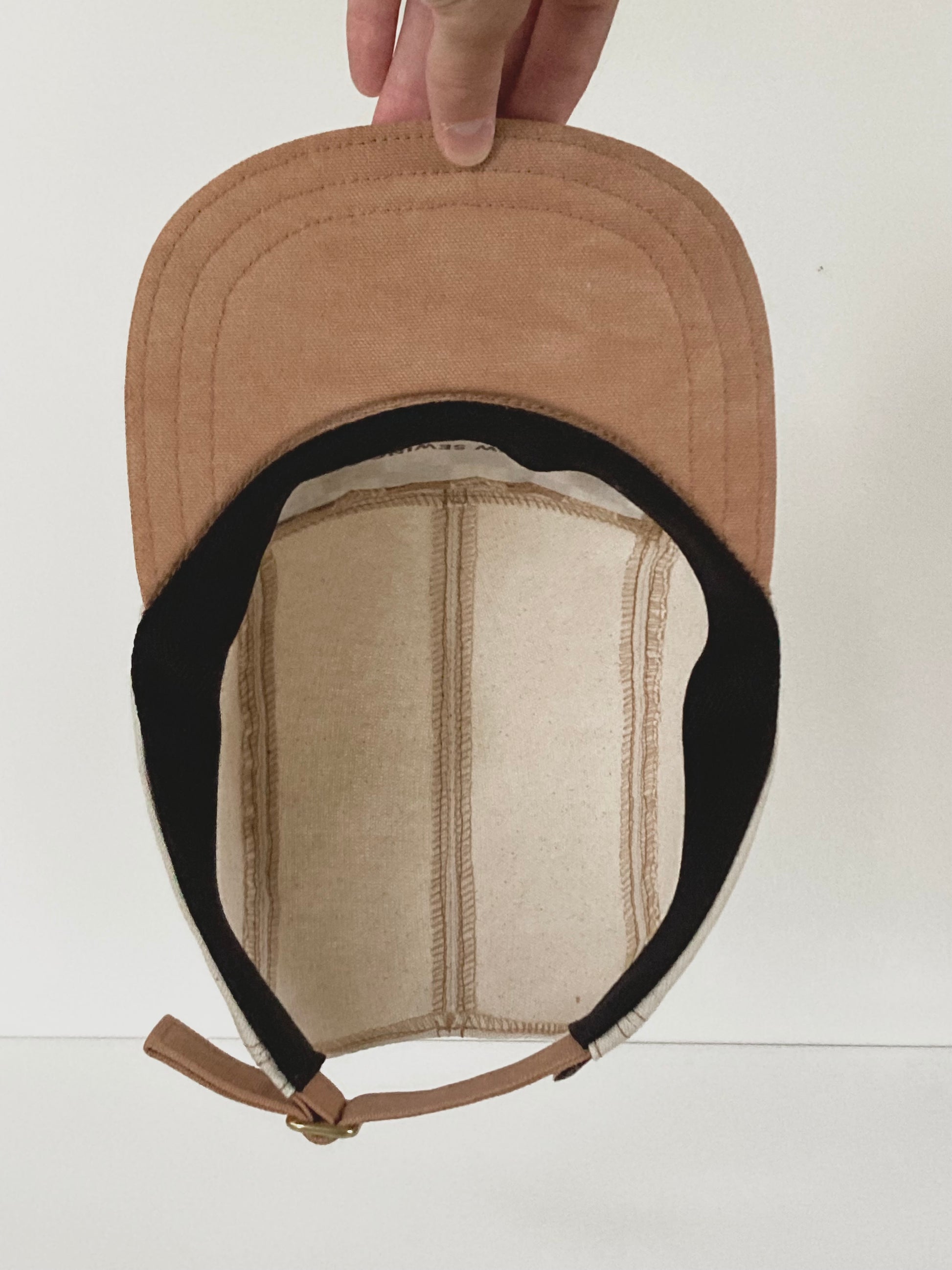 Soft brimmed five panel camp hat entirely dyed, cut, quilted and sewn by my own human hands. The fabric was naturally dyed in (very!) small batches with quebracho. The backstrap is also constructed by hand and features a solid brass slide.