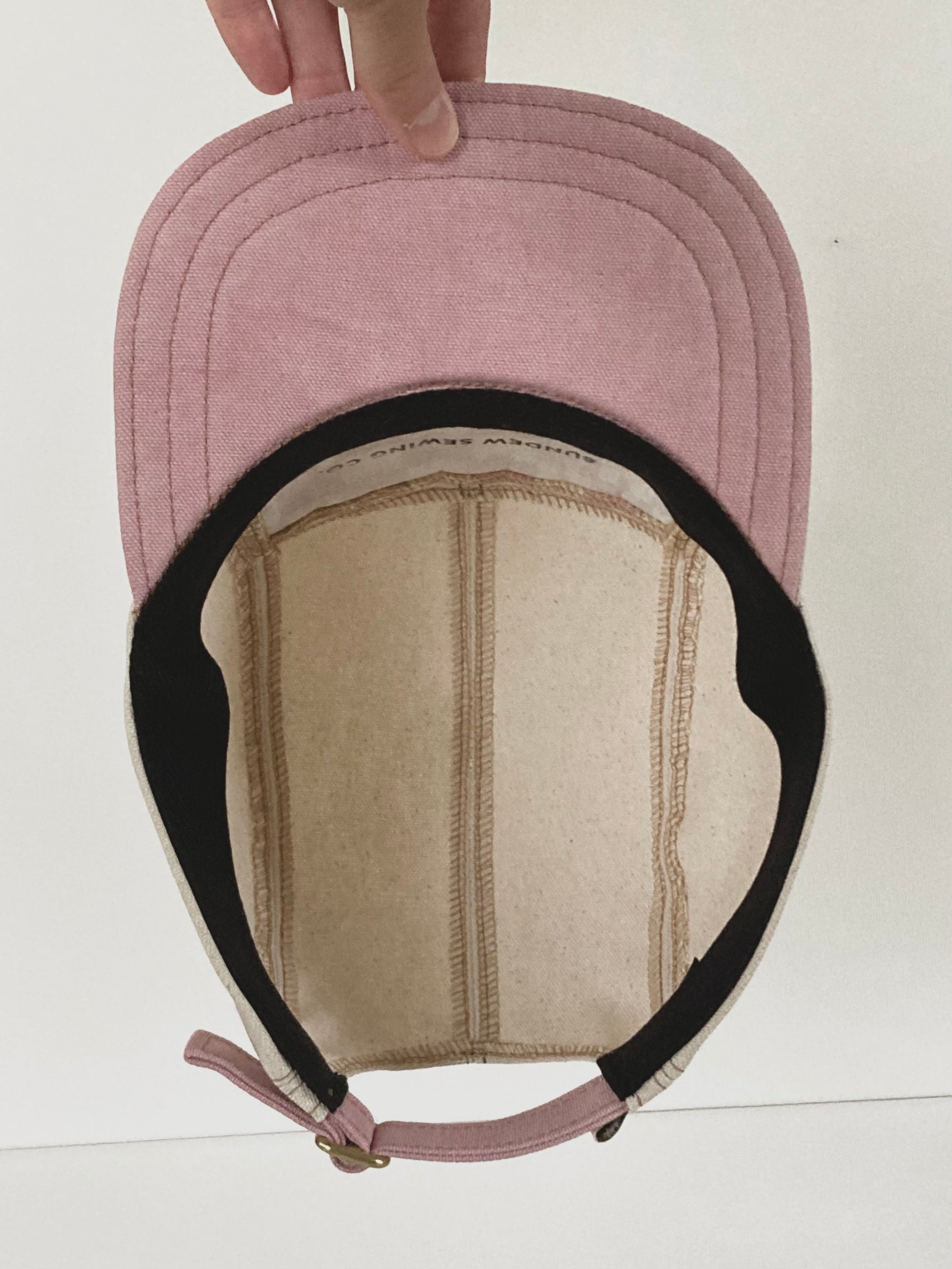 Soft brimmed five panel camp hat entirely dyed, cut, quilted and sewn by my own human hands. The fabric was naturally dyed in (very!) small batches with cochineal. The backstrap is also constructed by hand and features a solid brass slide.