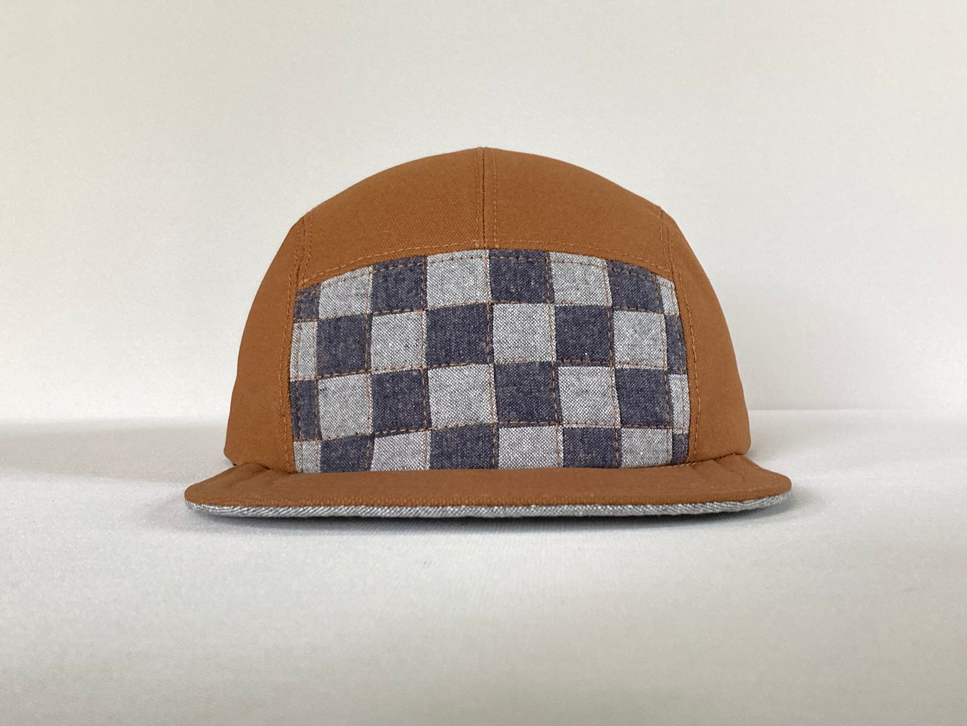 Made from scratch, soft brimmed five panel camp hat featuring a hand pieced and quilted front panel and brim. This hat is handmade from start to finish with meticulous care, and is made to be lived in.
