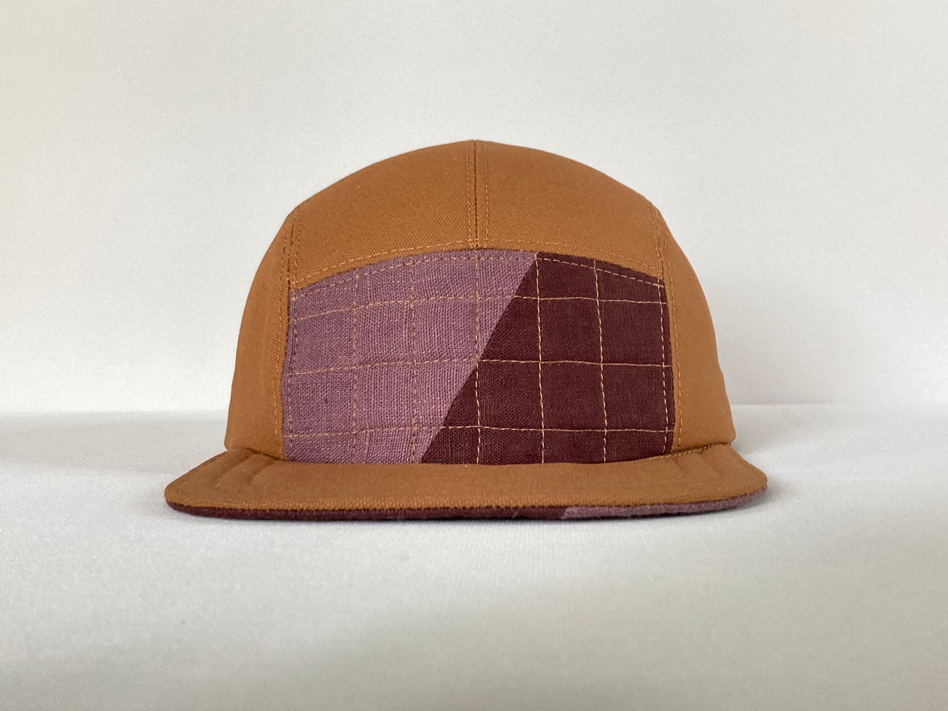 Made from scratch, soft brimmed five panel camp hat featuring a hand pieced and quilted front panel and matching brim. This hat is part of a special collection of one-of-a-kind camp hats created with scrap fabrics from another slow- and sustainable-fashion company, Conscious Clothing. It is handmade from start to finish with meticulous care, and is made to be lived in.