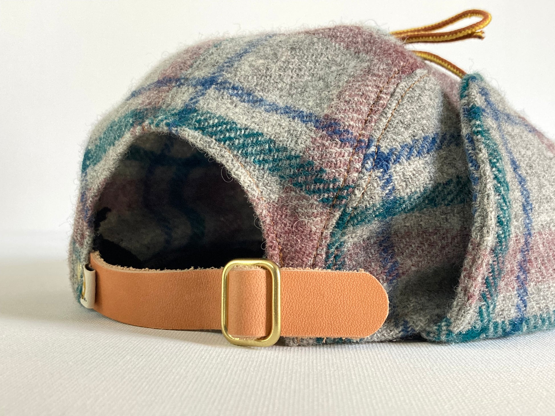 This hat is made with lightweight vintage wool fabric, with that classic scratchy-wool feel. It features a vegetable tanned leather back strap and solid brass hardware. The leather strap will continue to darken to a warm honey color over time. I only had enough fabric to make one!